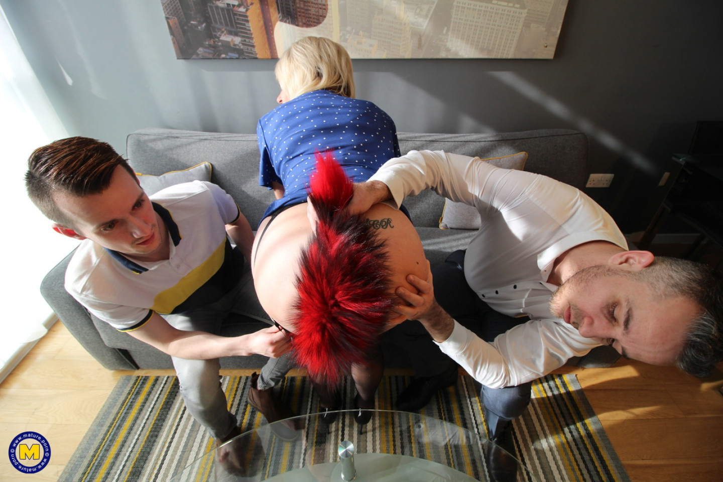 Older blonde sports a fox tail butt plug before fucking a couple of young men