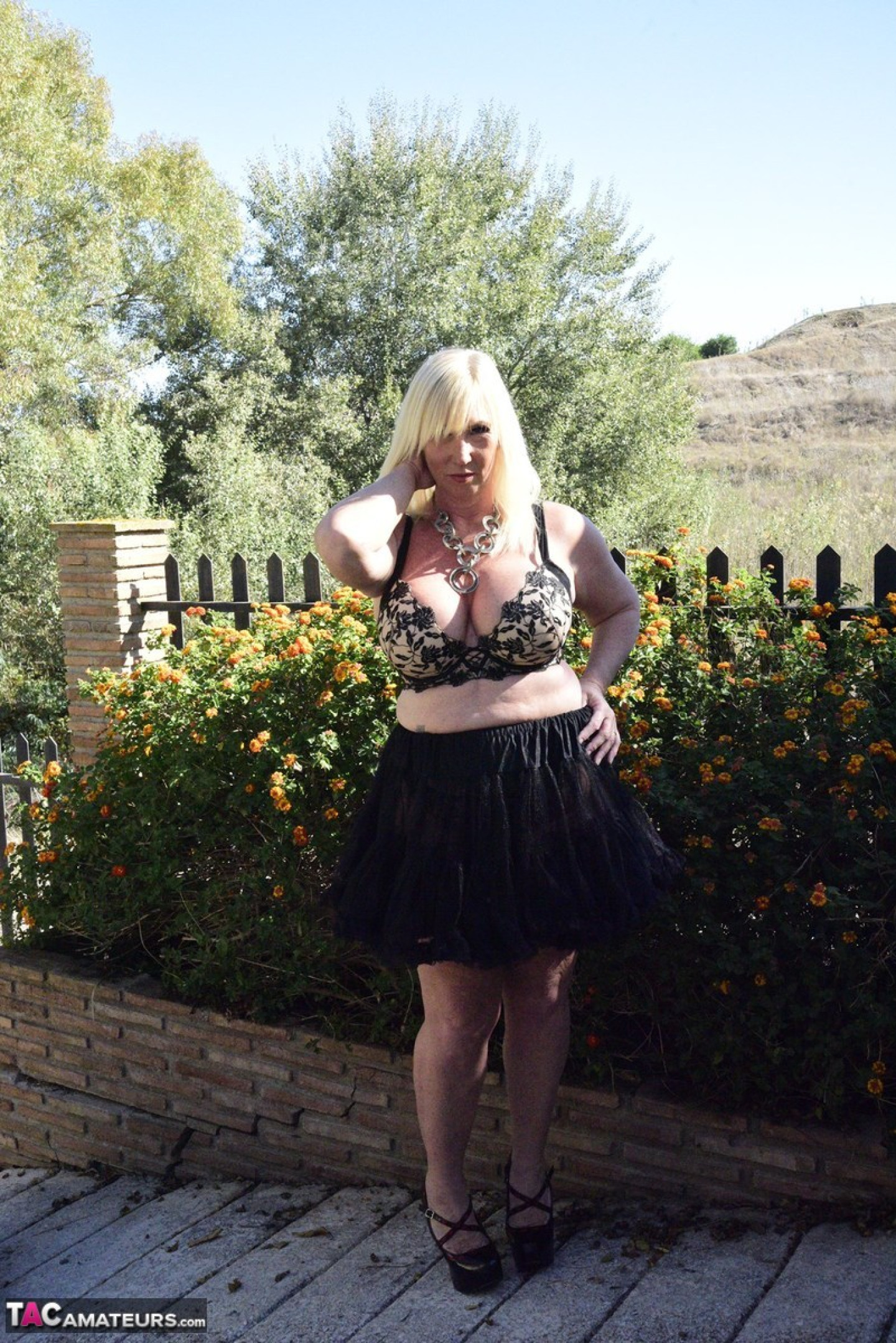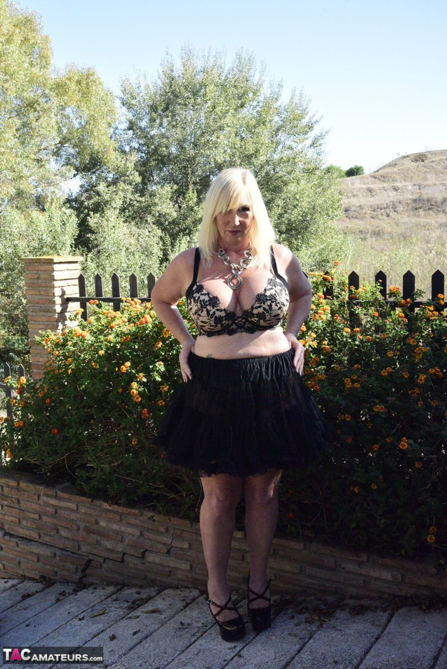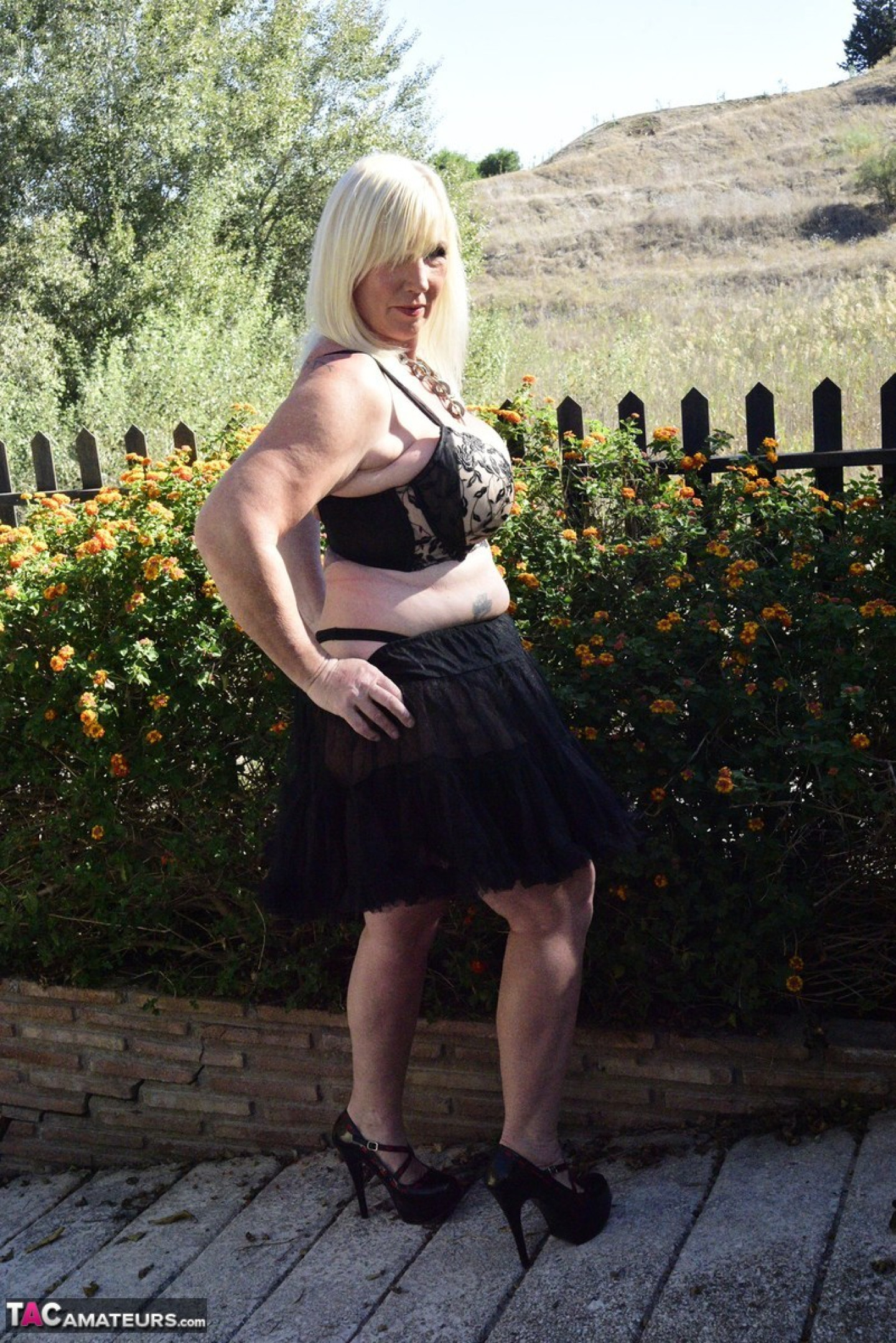 Blonde granny Melody exposes her overweight body in an English garden