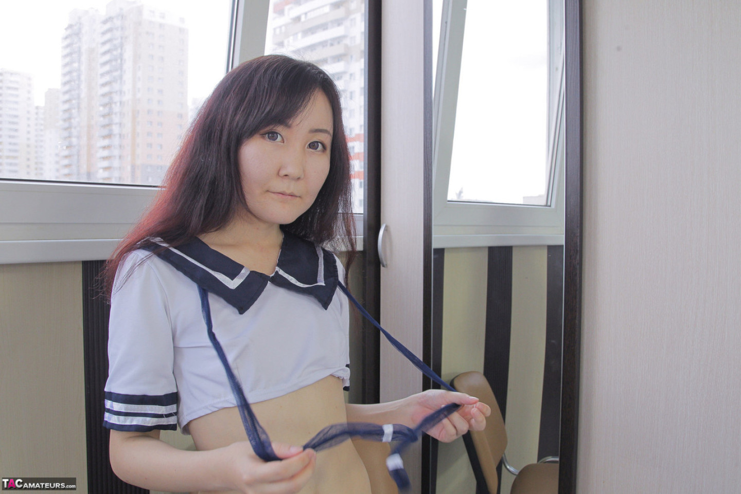 Japanese amateur Akuma Loli reveals her tattoos while on dressing by a mirror