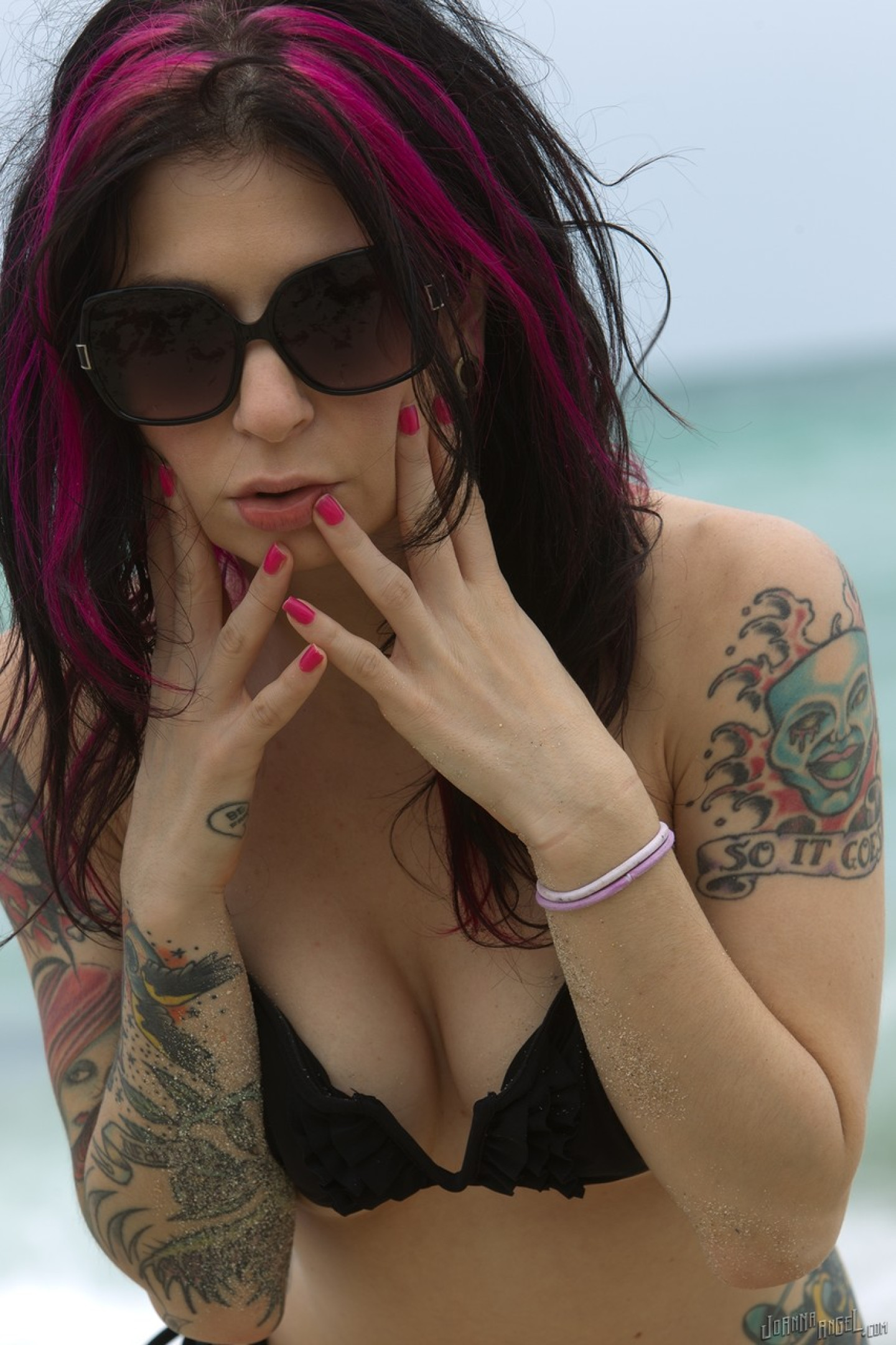 Tattooed model poses non nude at the beach in a bikini and sunglasses