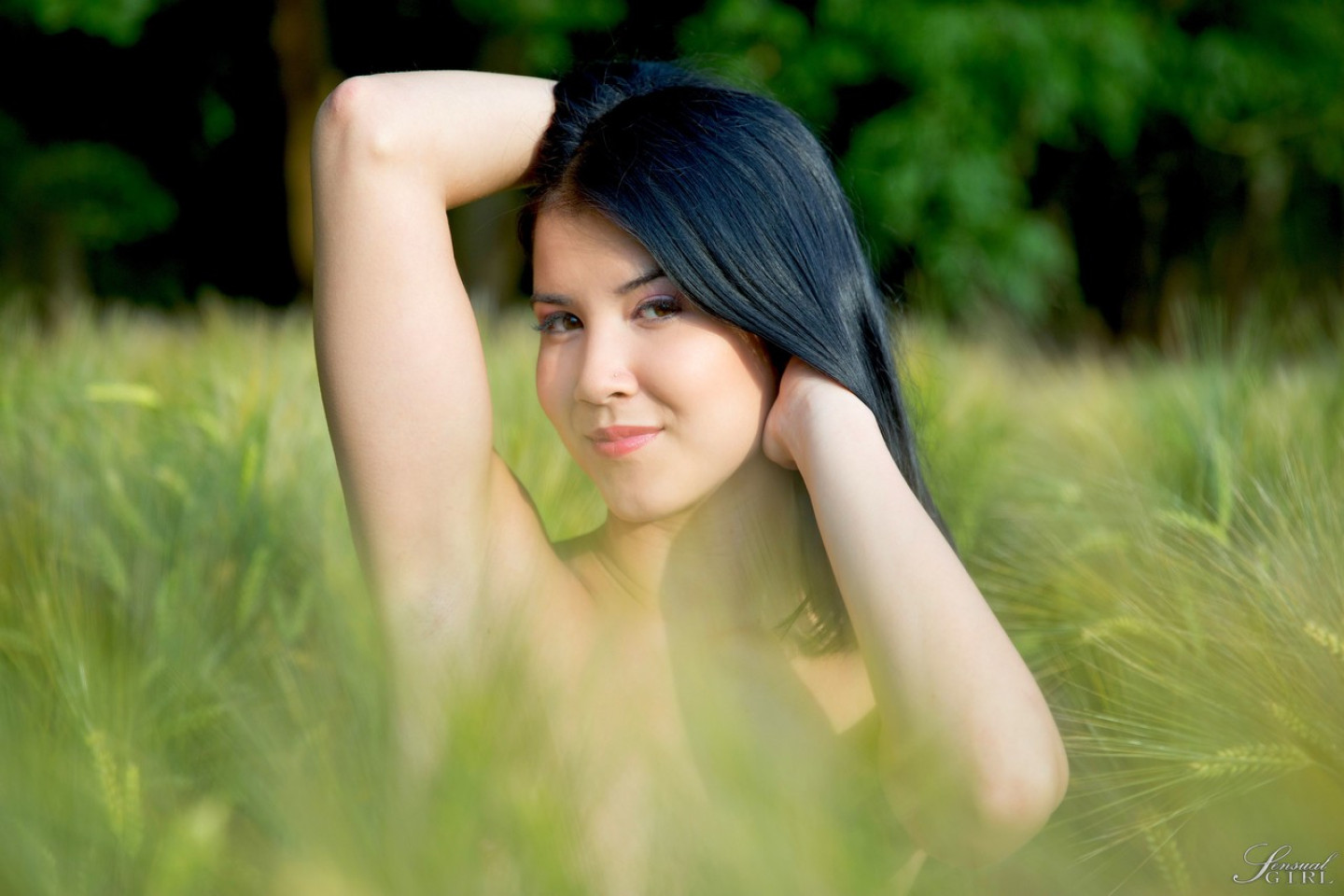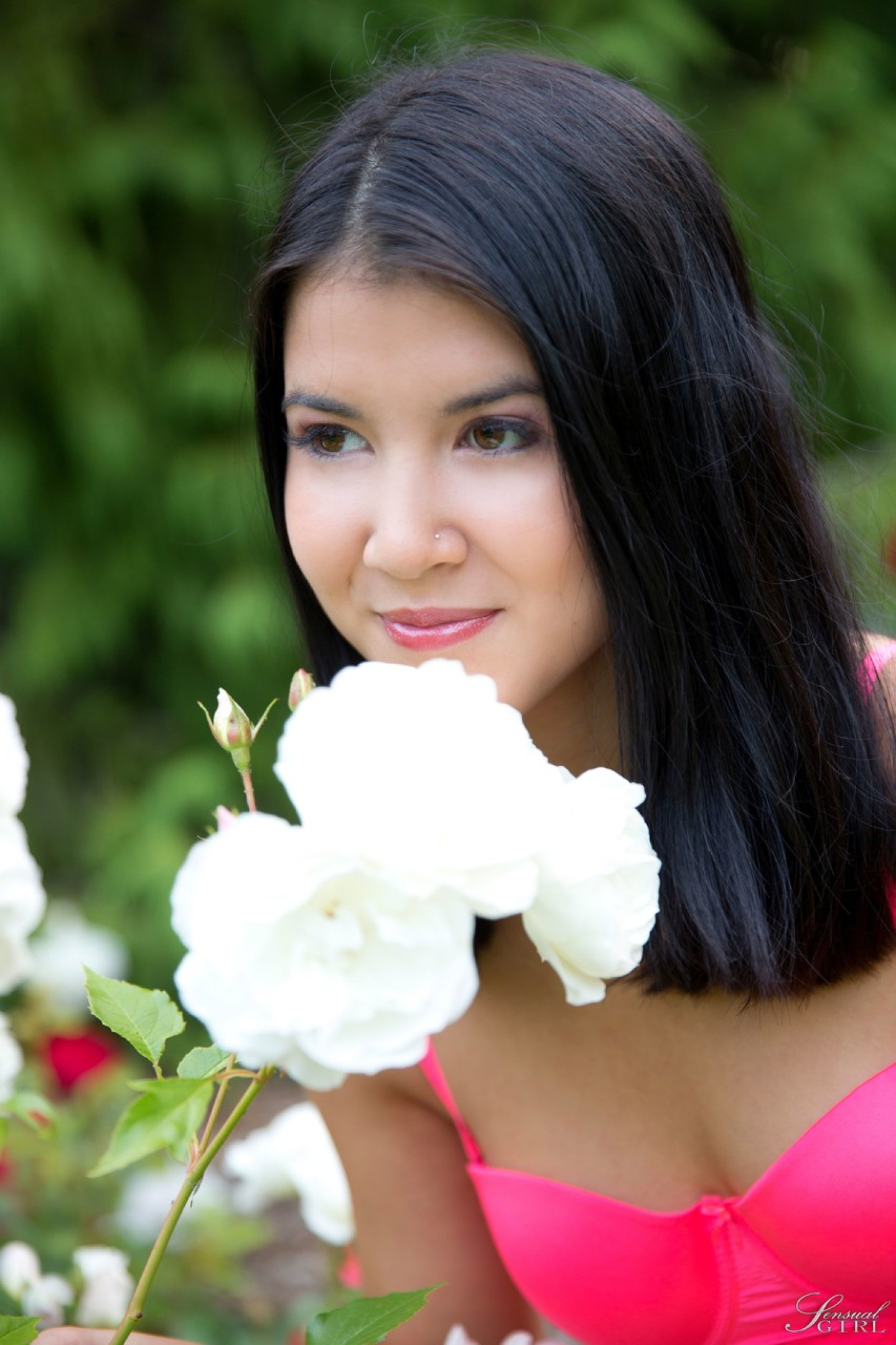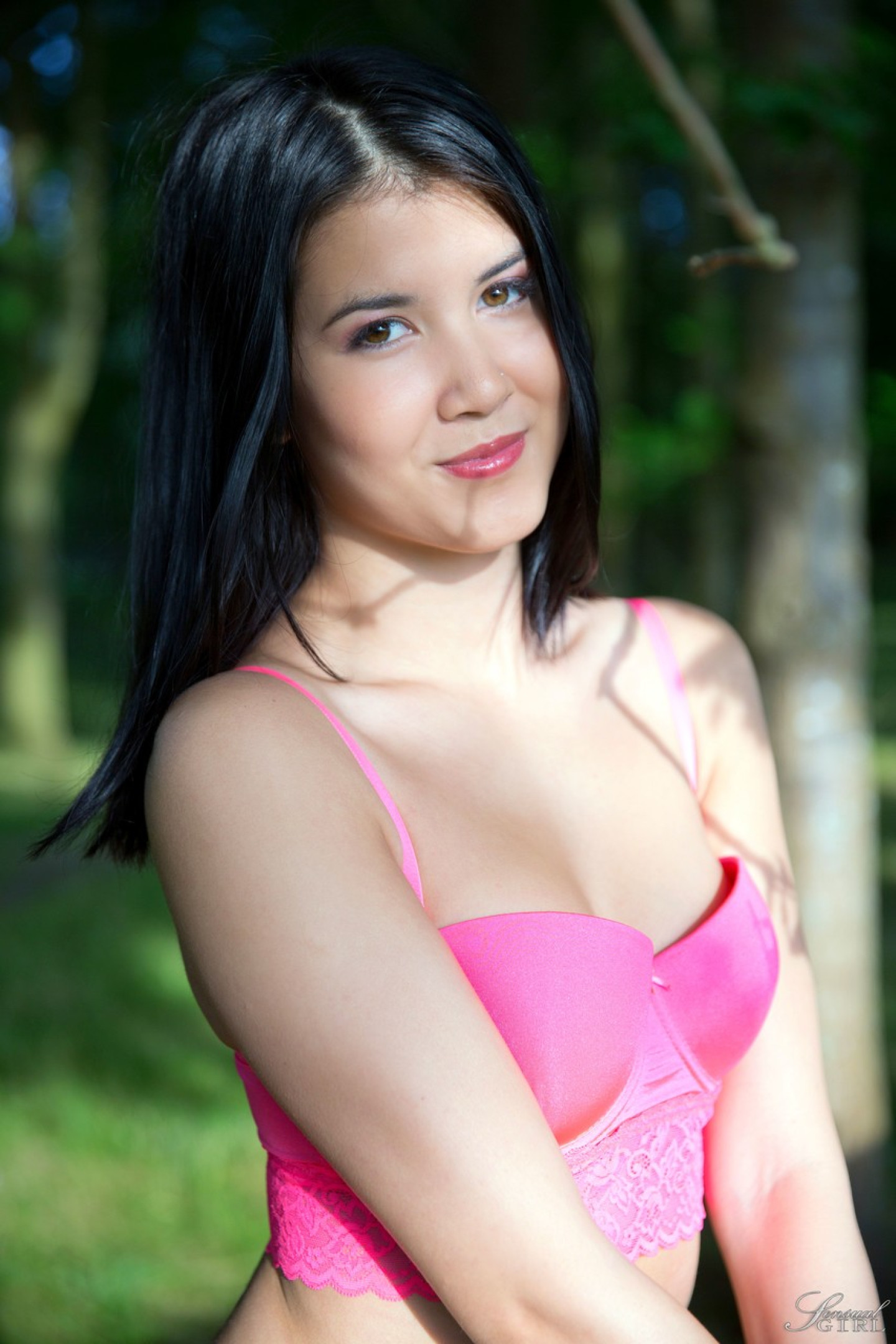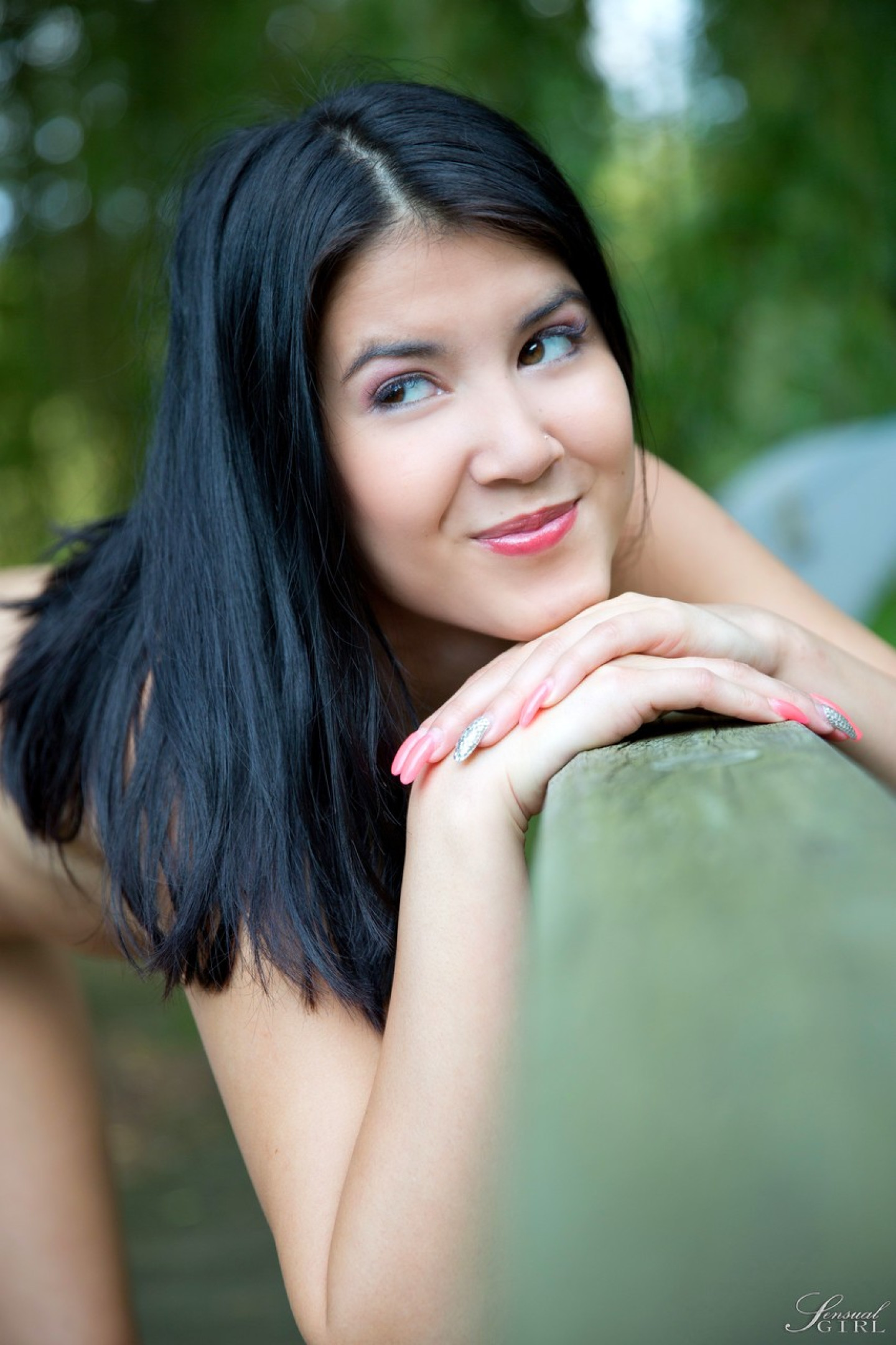 Young brunette Lady Dee strips down in the calm atmosphere outside